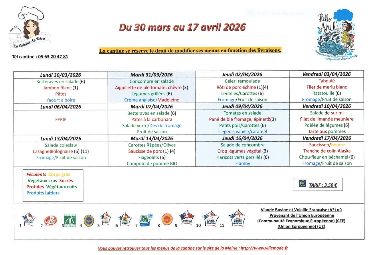 Menus du 30 mars au 17 avril 2026